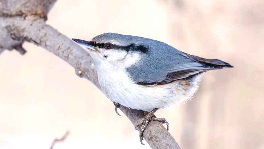Голова: Голова поползня выглядит довольно крупной по сравнению с телом. На ней выделяется черная полоска, проходящая через глаз, напоминающая "маску" разбойника. Эта полоска начинается от клюва, проходит через глаз и уходит к затылку, придавая птице немного озорной вид. Над глазом проходит тонкая белая бровь, которая контрастирует с темной полосой.