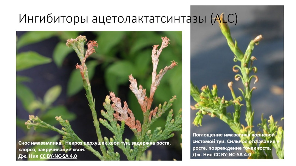 ) К данному классу гербицидов относятся имидазолиноны (имазапир - Грейдер, ВГР и др.) и сульфонилмочевины (триасульфурон входит в состав комбинированного гербицида Линтур, ВДГ и др.). Препараты этого класса ингибирует фермент ацетолактатсинтазу (ALS). ALS участвует в биосинтезе аминокислот: валина, лейцина и изолейцина. Ингибирование ALS блокирует синтез белка, что приводит к гибели сорных растений. Действующие вещества этого класса хорошо растворимы в воде, поэтому легко абсорбируются корнями, листьями и способны перемещаться по ксилеме и флоэме к апикальным точкам роста. Могут сохранятся в почве длительное время: триасульфурон обладают длительным остаточным действием до 2-3 лет, имазапир может сохраняться до одного года. После обработки происходит замедление/остановка роста растений, которая наступает в течение первых часов, видимые признаки появляются через несколько дней. Адсорбируясь в корневой системе, гербициды вызывают побурение корней, что приводит к полной гибели растений.
