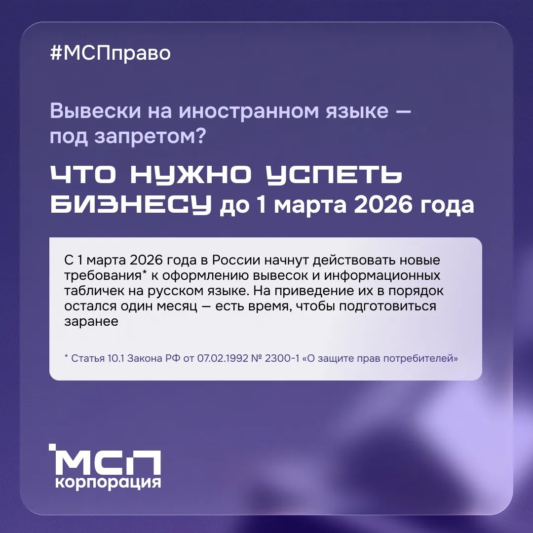 ? Что меняется: новые правила оформления вывесок, навигации, табличек, ценников и другой публичной информации для потребителей. ❗ Суть нововведения: вся информация должна быть представлена на русском языке. Даже если иностранные слова или латиница в офлайне считалась нормой 📆 Когда вступят в силу: уже через месяц — 1 марта 2026. Сейчас идеальное время, чтобы разобраться и подготовиться до конца 2026 без аврала! Подробности в карточках от МСП. #Важное #Маркетинг #Реклама