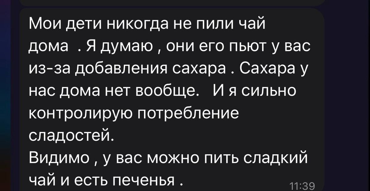 Да и ребята не просто так пили сладкий чай. Они после школы пришли домой, а есть там нечего, и отправились на занятия голодными. Пустое брюхо к ученью глухо, это давно известная мудрость. Так, может, маме сначала надо разобраться с их режимом питания, а потом писать нам о запретах на сладкий чай? Ведь они едят сахар только из-за того, что голодны.