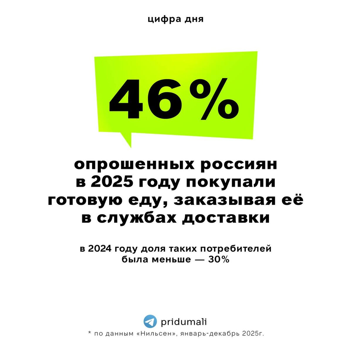 В рубрике «Цифра дня» свежие данные НИЛЬСЕН — 46% опрошенных россиян покупали готовую еду в 2025 году с помощью сервисов доставки. Ритейлеры также отмечают смену тренда. Уже сейчас доля проникновения готовой еды в чеки существенно выше в онлайн-каналах по сравнению с традиционными магазинами. Второе место в списке каналов продаж сохранили за собой супермаркеты, где в прошлом году готовую еду покупали 44% респондентов. 👉подписаться на @pridumali #исследования
