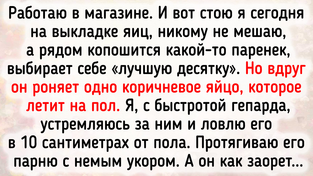 Работаю в магазине. И вот стою я сегодня на выкладке яиц, никому не мешаю, а рядом копошится какой-то паренек, выбирает себе «лучшую десятку». Но вдруг он роняет одно коричневое яйцо, которое летит на пол. Я, с быстротой гепарда, устремляюсь за ним и ловлю его в 10 сантиметрах от пола. Протягиваю его парню с немым укором. А он как заорет: "Гарри Поттер поймал золотой снитч! Гриффиндор победил!" Когда я проржался и спросил, мол почему Гриффиндор, тот сказал, что у меня форма просто красная. Он сделал мой день! © Unknown author / Pikabu