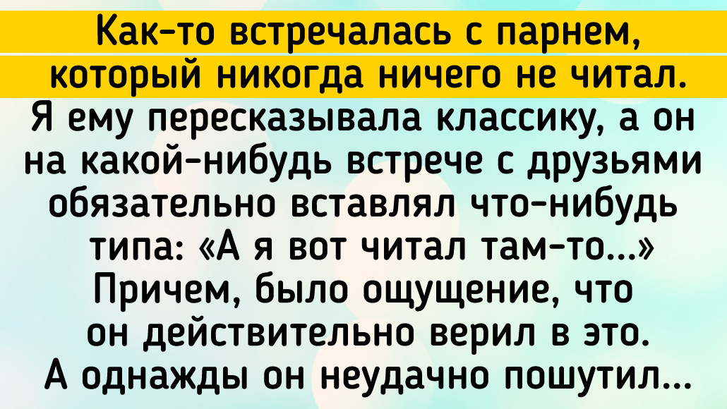 Как-то встречалась с парнем, который никогда ничего не читал. Я ему пересказывала классику, а он на какой-нибудь встрече с друзьями обязательно вставлял что-нибудь типа: «А я вот читал там-то...» Причем, было ощущение, что он действительно верил в это. А однажды он неудачно пошутил. Мол, мне повезло попасть в его круг общения. Я, конечно же, послала его лесом. Но перед тем, как расстаться, рассказала ему несколько фейковых книжных сюжетов. На перспективу. © vasilisaPRO / Pikabu