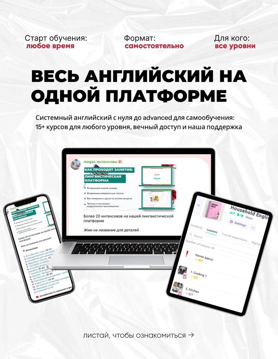 📲 С нами уже более 12 000 учеников, пробуй и ты! → На платформе: • 15+ курсов и 1000+ уроков для любого уровня — от новичка до C1; • 9000+ интерактивных заданий и практических упражнений; • дополнительные материалы и доступ к закрытому каналу с носителями языка; • доступ ко всем будущим курсам, которые еще не вышли. → Как итог: • самостоятельно вырастешь на целый уровень всего за пару месяцев; • будешь в курсе самого актуального английского от американцев, • укрепишь грамматику, лексику и произношение без репетиторов. Вечный доступ к трендовому английскому — всего от 6000 рублей 🇺🇸 Забрать 🥹