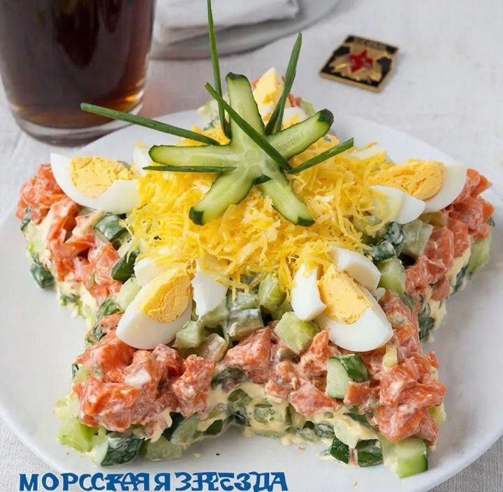 » Оригинальный салат который поможет украсить мужской стол ко Дню Защитника Отечества! Ингредиенты: - Консервированная красная рыба (горбуша, семга) — 1 банка (~200 г) - Варёные яйца — 3 штуки - Майонез — 3 столовых ложки - Огурец свежий — 1 штука - Зеленый лук — пара веточек Приготовление: 1. Откройте банку консервированной красной рыбы и разомните вилкой до однородной массы. 2. Отделите белки от желтков вареных яиц. Белки нарежьте мелким кубиком, а желтки измельчите отдельно ножом или растолките ложечкой. 3. Огурец тонко нарежьте соломкой. 4. Мелко порубите зеленый лук. 5. Соедините рыбную массу, белок, огурец и зеленый лук. Перемешайте, заправьте майонезом и снова хорошо перемешайте. 6. Желтки отложите в отдельную посуду и потрите на мелкой терке. Оформление: - Возьмите плоскую тарелку и выкладывайте салат горочкой посередине. - Поверх уложенного салата нанесите тонким слоем слой желтков, создавая эффект песчаного берега. - Украсьте композицию звездообразными элементами из ог