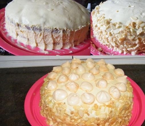 Достаём охлажденный тортик, выравниваем бока и обсыпаем их миндалём, а с верху украшаем безешками.