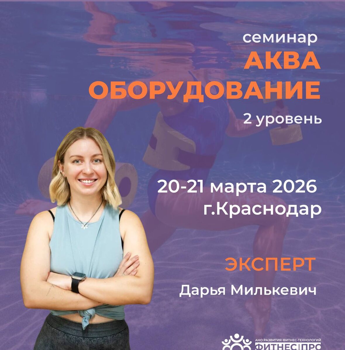» 👍Приглашаем вас на двухдневный семинар «Аква Фитнес 2 , Оборудование и форматы уроков», специально разработанный для тех, кто уже прошел базовый курс по аква-фитнесу и готов углубить свои знания и навыки! Ваш эксперт: Дарья Милькевич Семинар проведет Дарья Милькевич, координатор водных программ и мастер-тренер фитнес-клуба "XFIT Солнечный" в Краснодаре. Дарья имеет более чем 10-летний опыт работы в аквафитнесе, является экспертом ФПФКК по аквафитнесу и была признана лучшим инструктором по аквафитнесу Краснодарского края в 2024 году. ⚡️Что вы получите на семинаре? — Освоение методик проведения различных типов тренировок: силовой, интервальной, круговой. — Практическое использование оборудования (гантели, нудлы, джоггеры, перчатки).Мы расскажем о каждой единице оборудования, её преимуществах и особенностях использования. — Составление готовых аква-программ с отработкой правильной техники упражнений с оборудованием. — Отработка теории и практики на суше и в воде. — Обратная связь