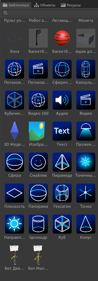В редактор встроено некоторое количество стандартных бесплатных объектов со встроенной логикой. Сочетая их, можно добиться неплохой функциональности проекта. Для сцены в нашем проекте выбраны стандартные и импортированные объекты - изображения. Имена изменены для упрощения работы в визуальном редакторе. В данном разделе находятся импортированные через Библиотеку объекты.