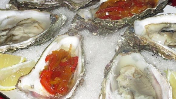 Раковины устриц открываем, отделяем моллюсков. Выкладываем раковины на посыпанное крупной поваренной солью сервировочное блюдо и в каждую выкладываем немного обжаренных овощей. Сбрызнем маслом омара и изысканная закуска готова!