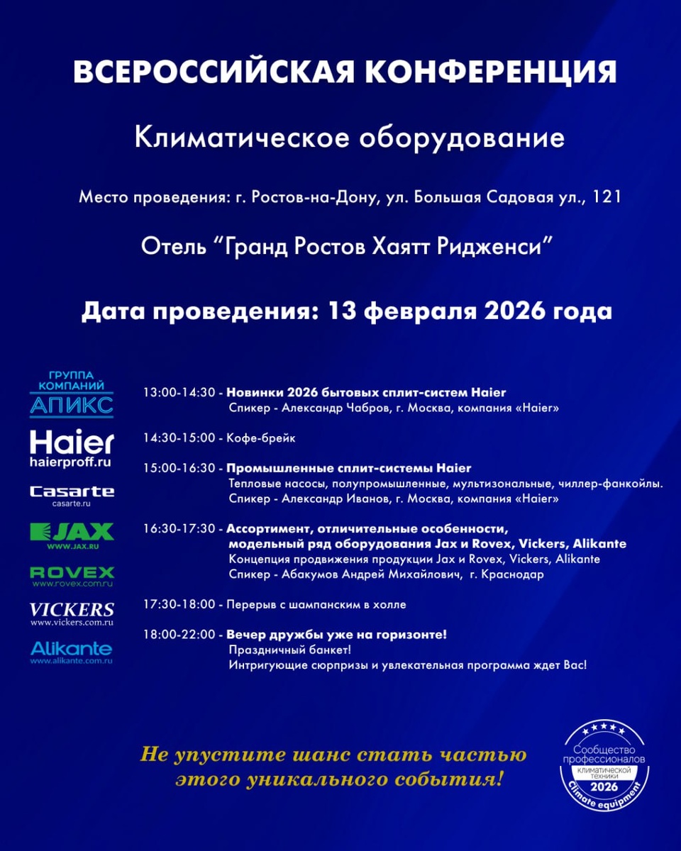 ! 🔼 Официальная программа ежегодной конференции «Апикс» в Ростове-на-Дону Ждём вас 13 февраля в отеле «Гранд Ростов Хаятт Ридженси» в 13:00 🕐 💙До встречи!