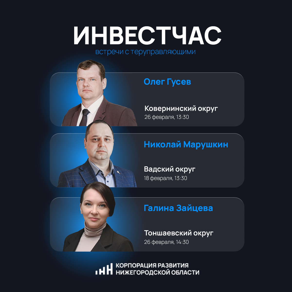 Встречи в формате «Инвестиционного часа» проведут территориальные управляющие Корпорации. На них предприниматели смогут: - получить бесплатные консультации по вопросам, касающимся реализации инвестпроектов, - ознакомиться с действующими мерами поддержки бизнеса, - узнать больше о цифровых сервисах для инвесторов и возможностях Корпорации развития. Николай Марушкин ответит на вопросы предпринимателей Вадского округа 18 февраля в 13:30. Встреча пройдет по адресу село Вад, ул. 1 Мая, 41. Вопросы можно направить на почту: marushkin@nn-invest.ru. Встреча с Олегом Гусевым в Ковернинском округе состоится 26 февраля в 13:30 по адресу Ковернино, ул. Карла Маркса, 4. Вопросы принимаются на почту: ogusev@nn-invest.ru. Также 26 февраля в 14:30 Галина Зайцева проведет встречу в р.п. Тоншаево. Мероприятие пройдет по адресу ул. Свердлова, 2А. Вопросы можно направить на электронную почту: zaitseva@nn-invest.ru. «Встречи территориальных управляющих с предпринимателями в муниципалитетах проходят на регу