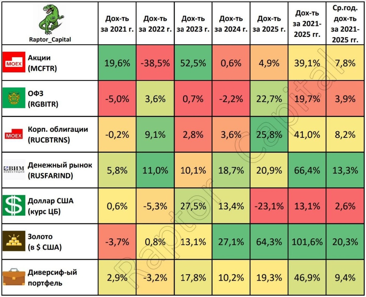 ? 👉Виды активов: Raptor_Capital сделал таблицу по данным с сайта Мосбиржи без учёта налогов, сравнив динамику за 5 лет следующих активов: ▪️Акции (индекс Мосбиржи полной доходности брутто MCFTR, показывает изменение IMOEX с учётом дивидендов); ▪️ОФЗ (индекс совокупного дохода гос. облигаций RGBITR с учётом купонов); ▪️Корпоративные облигации (индекс совокупного дохода корп. облигаций RUCBTRNS, показывает динамику облигаций с дюрацией от 1 года и кредитным рейтингом выше А– с учётом купонов); ▪️Денежный рынок (индекс накопленной доходности денежного рынка RUSFARIND, сравним с доходностью LQDT); ▪️Доллар США (курс доллара к рублю от ЦБ РФ); ▪️Золото (цена унции золота в долларах США). 👉Динамика активов Исходя из изменения цены/курса/индекса в 2021-2025 годах, можно сделать следующие выводы: ▪️Наибольшую накопленную доходность за последние 5 лет показали золото (+101,6% или ≈20,3% в год) и денежный рынок (+66,4% или ≈13,3% в год). Наименьшую совокупную доходность за 5 лет принесли п