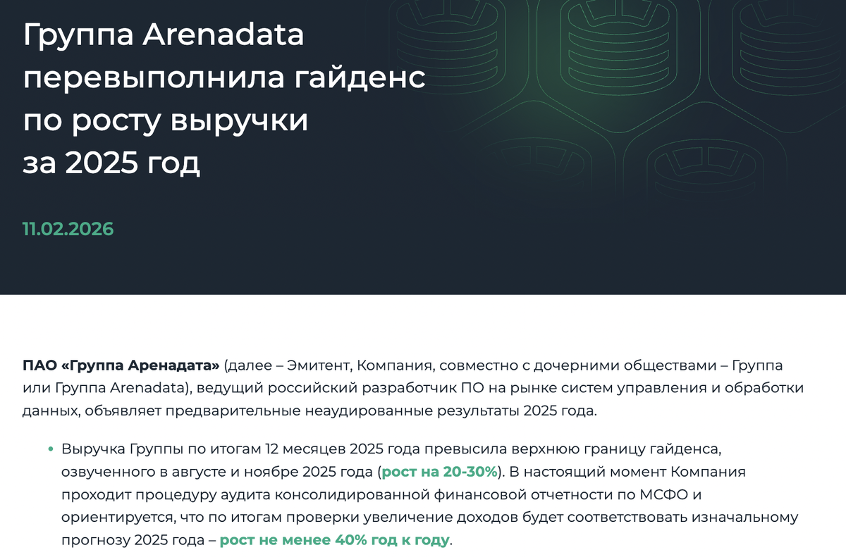 И это не предел. Дело в том, что выручка выросла более, чем на 40% в 2025 году (гайденс компании был +20-30%, мои ожидания по выручке +14%). Мои ожидания строились на том, что за 9М 2025 выручка Аренадаты упала на 45%. Скорее всего, это был эффект высокой базы прошлого года (когда цель была сдвинуть выручку на 1 пол. 2024, чтобы показать более высокие темпы роста перед IPO). Такой существенный рост выручки дает основание прогнозировать высокую прибыль (NIC). Жду NIC за 2025 год = 2,55 млрд руб., за 2026 год = 3,12 млрд руб. (пока закладываю в модель темп роста 20%). 💸 Дивиденды При выплате на дивиденды 75% от NIC выплата составит 9,16 руб. на акцию (8,6% дивиденд) за 2025 и 11,22 руб. (10,6%) за 2026. 📊 Оценка Аренадата оценивается в P/NIC 2025 = 9 и P/NIC 2026 = 7. Для текущих темпов роста такая оценка не выглядит дорогой. Итого: среди IT-компаний Аренадата теперь самая дешевая по мультипликаторам из тех, что у меня в покрытии (все, кроме Базиса), Аренадата дешевле Яндекса и ХХ. Др