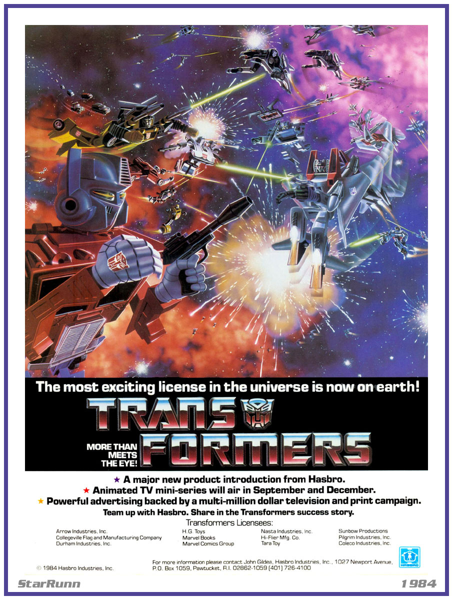Мы добрались до пятой, финальной категории обзора, о которой подавляющее большинство фанатов не знает практически ничего. Компания Хасбро сразу поняла, что трансформеров ждёт успех, поэтому продавала права на использование лицензии множеству компаний. На следующий год этот список ещё расширится, поток разнообразной продукции ослабнет лишь в 1986 году. Нам удалось найти три версии документа за 1984 год, отражающих состояние лицензии, два из них представляют собой один и тот же флаер в разные моменты времени, другой - шестистраничное руководство по маркетингу. Он, в частности, указывает, что доставка игрушек в магазины США началась в конце-середине апреля. Также упоминается "печатная рекламная кампания" отличная от комикса. Целевой аудиторией трансформеров указаны дети от 5 лет. При покупке лицензии передавалась визуальные материалы, включавшие логотипы и рисунки персонажей. Некоторые из упомянутых в документах компаний уже полностью описаны в предыдущих статьях, другие должны бы туда по