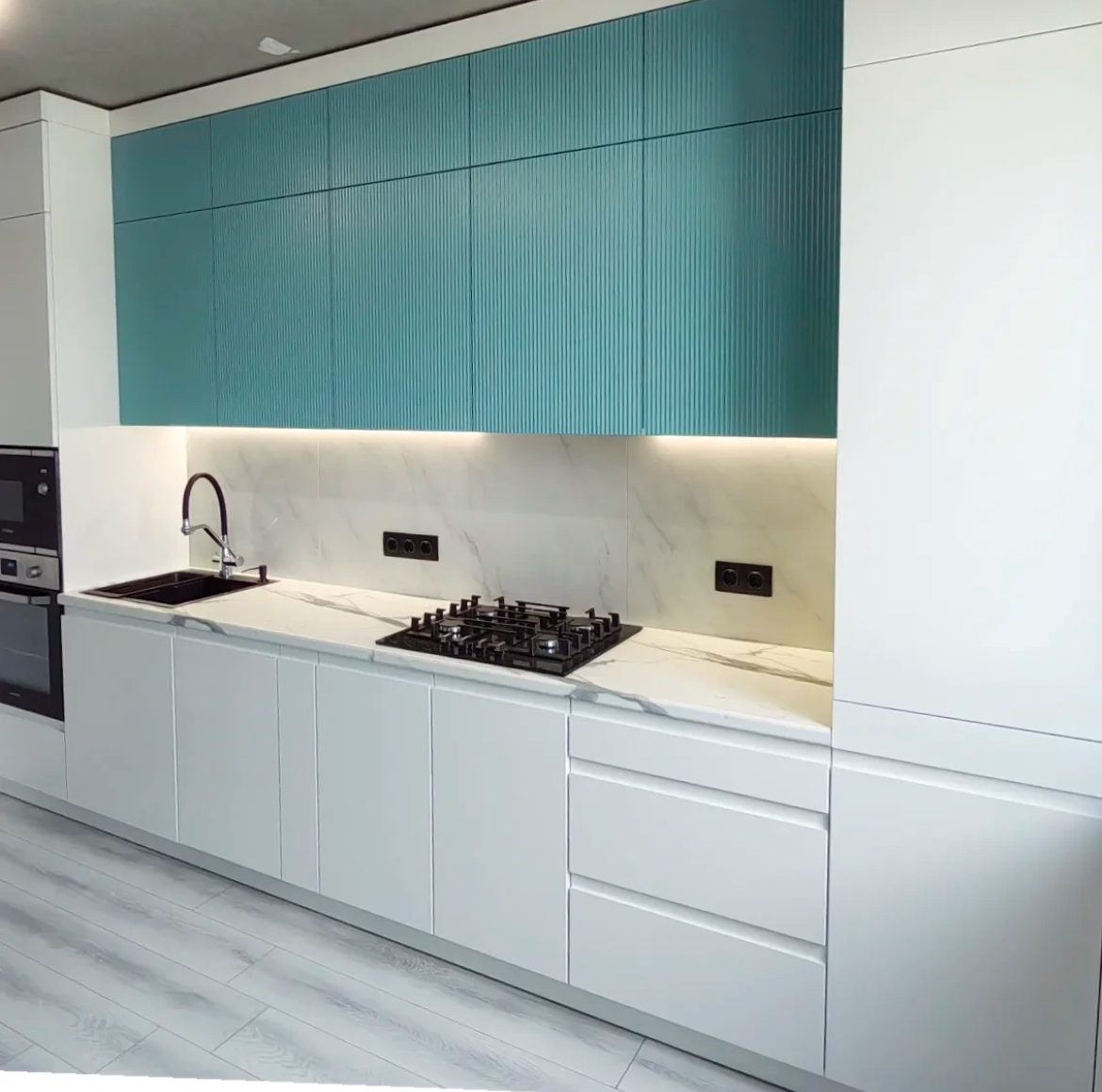 Акцентные верхние шкафы – один из самых сильных современных приемов в дизайне кухни. Если раньше верхний ярус старались сделать максимально нейтральным и растворить, то сегодня дизайнеры всё чаще используют его как выразительный элемент композиции. Цвет, фактура, фрезеровка и рифление превращают верхние фасады в главный визуальный акцент кухни. Разберём подробно, как работают такие решения, в каких интерьерах они особенно уместны и какие задачи решают на примере кухни с фактурными акцентными верхними шкафами. Это верхний ряд кухонных фасадов, который осознанно выделен относительно нижнего яруса или пеналов. Выделение может быть за счёт: На фото отличный пример: спокойный белый низ и пеналы + выразительный верх в цвете морской бирюзы с вертикальной текстурой. Верхний ярус сразу становится композиционным центром. Современная кухня всё чаще интегрируется в жилое пространство. Она должна выглядеть не как технический блок, а как часть интерьера. Акцентный верх решает сразу несколько задач: