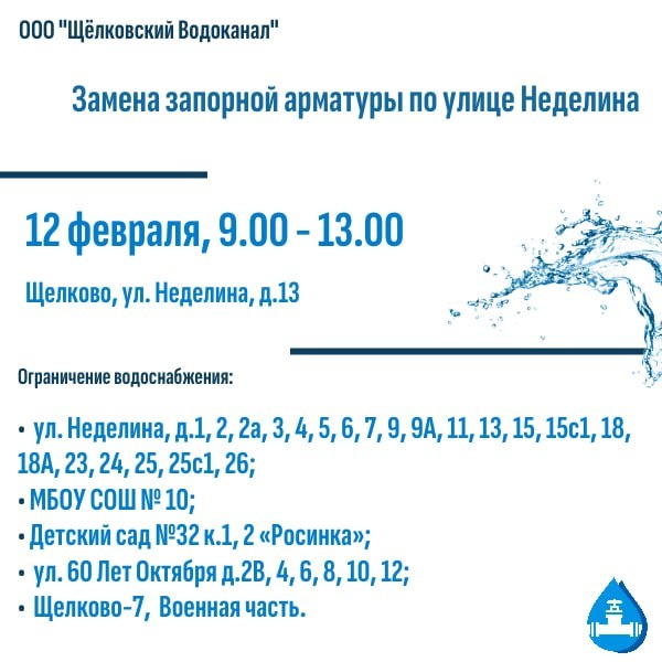 UPD Работы продлены до 15.30. 🛠 Замена запорной арматуры по улице Неделина В связи с проведением работ по замене запорной арматуры на водопроводе диаметром 100 мм (Щелково, ул. Неделина, д.13) будет отключено холодное водоснабжение 12 февраля, с 9.00 до 13.00 по адресам: ➡️ ул. Неделина, д.1, 2, 2а, 3, 4, 5, 6, 7, 9, 9А, 11, 13, 15, 15с1, 18, 18А, 23, 24, 25, 26; ➡️ ул. Неделина д.25с1; ➡️ МБОУ СОШ № 10; ➡️ Детский сад №32 к.1 «Росинка»; ➡️ ул. 60 Лет Октября д.2В, д.4, д.6, д.8, д.10, д.12; ➡️ Детский сад №32 к.2 «Росинка»; ➡️ Щелково-7 территория ВЧ 26188. Приносим извинения за доставленные неудобства. Телефон аварийно-диспетчерской службы водоканала: 84965621172. 🌐Наш сайт | Мах | ВКонтакте | Одноклассники | Ютуб | Рутуб | Yappi