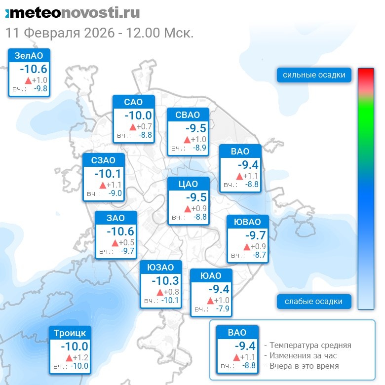 В 12:00 в Москве было от -10.8°C до -8.5°C, средняя температура -9.7°C #погода #Москва #зима #температура #11февраля #среда