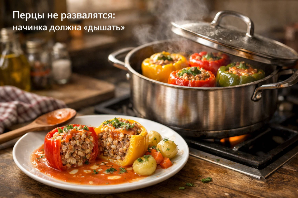Когда начинка утрамбована слишком плотно, расширяющемуся рису просто некуда деваться. Он начинает давить на стенки перца изнутри. Перец и без того размягчается при тушении, его структура становится более хрупкой. Под давлением изнутри стенки не выдерживают и рвутся. Начинка вываливается наружу, смешивается с соусом, и вместо аккуратного блюда получается каша.