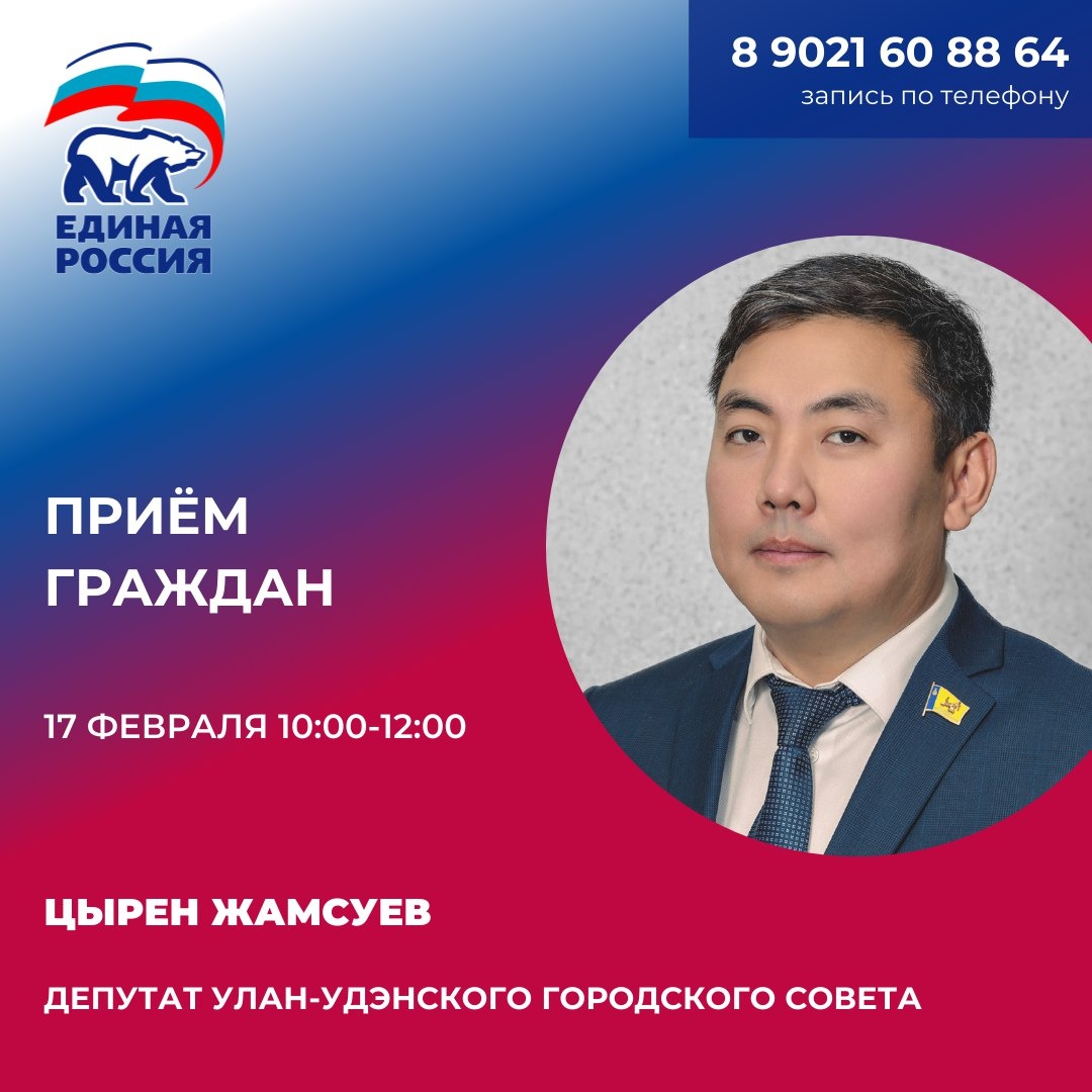 📆Прием депутата Цырена Жамсуева пройдет 17 февраля с 10:00 до 12:00. 👩💻Для того, чтобы попасть на прием, необходима предварительная запись. Записаться можно по телефону: 89021-60-88-64. 📍Адрес Штаба общественной поддержки: г. Улан-Удэ, ул. Борсоева, 7а, 1 этаж. 👉Горсовет Улан-Удэ в MAX | Telegram | ВК | ОК