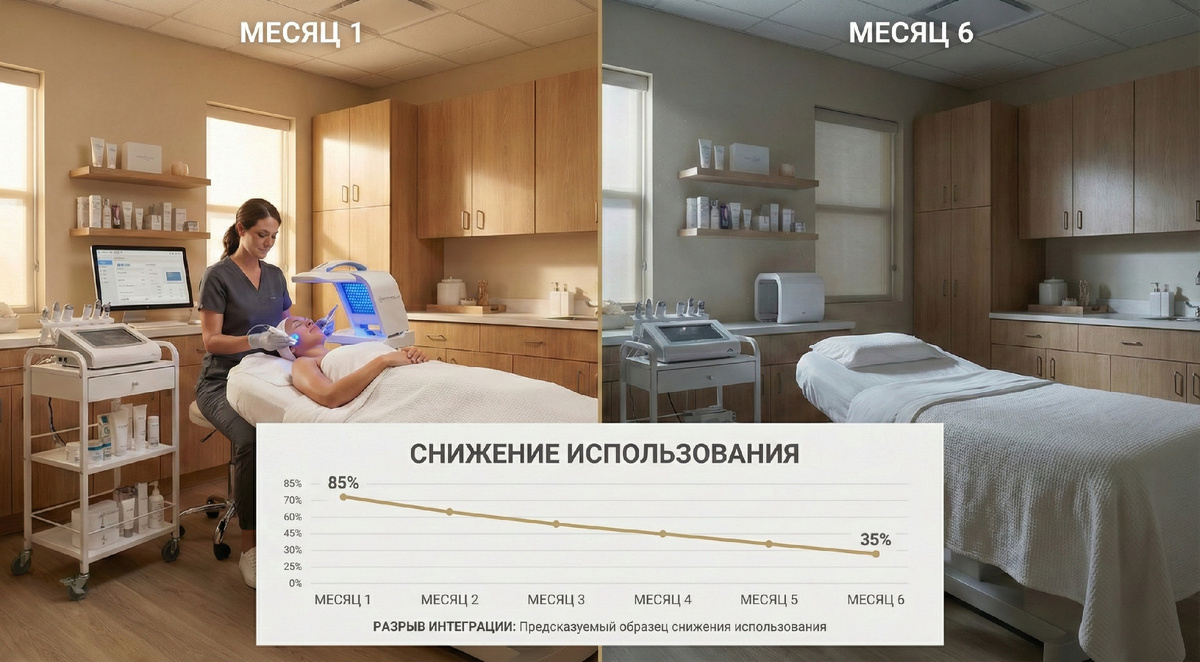 • к 6 месяцу — стабилизация на уровне 30–40% загрузки В результате оборудование, рассчитанное на 10–12 процедур в день, выполняет лишь 3–4. Кабинеты простаивают в непиковые часы, а персонал уверенно работает технически, но неуверенно продаёт результат. Главный фактор — отсутствие интеграции в бизнес-модель. Классический путь внедрения оборудования выглядит так: Но оборудование — это не готовое решение. Это только один элемент системы. Именно эти разрывы не позволяют оборудованию в