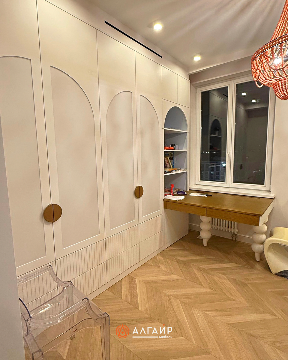 Письменный стол мы интегрировали в подоконную зону. Это лучшее решение для детских глаз — максимум естественного света во время занятий 📚 Особый шарм рабочей зоне придали фигурные ножки стола, будто сказочный арт-объект.
