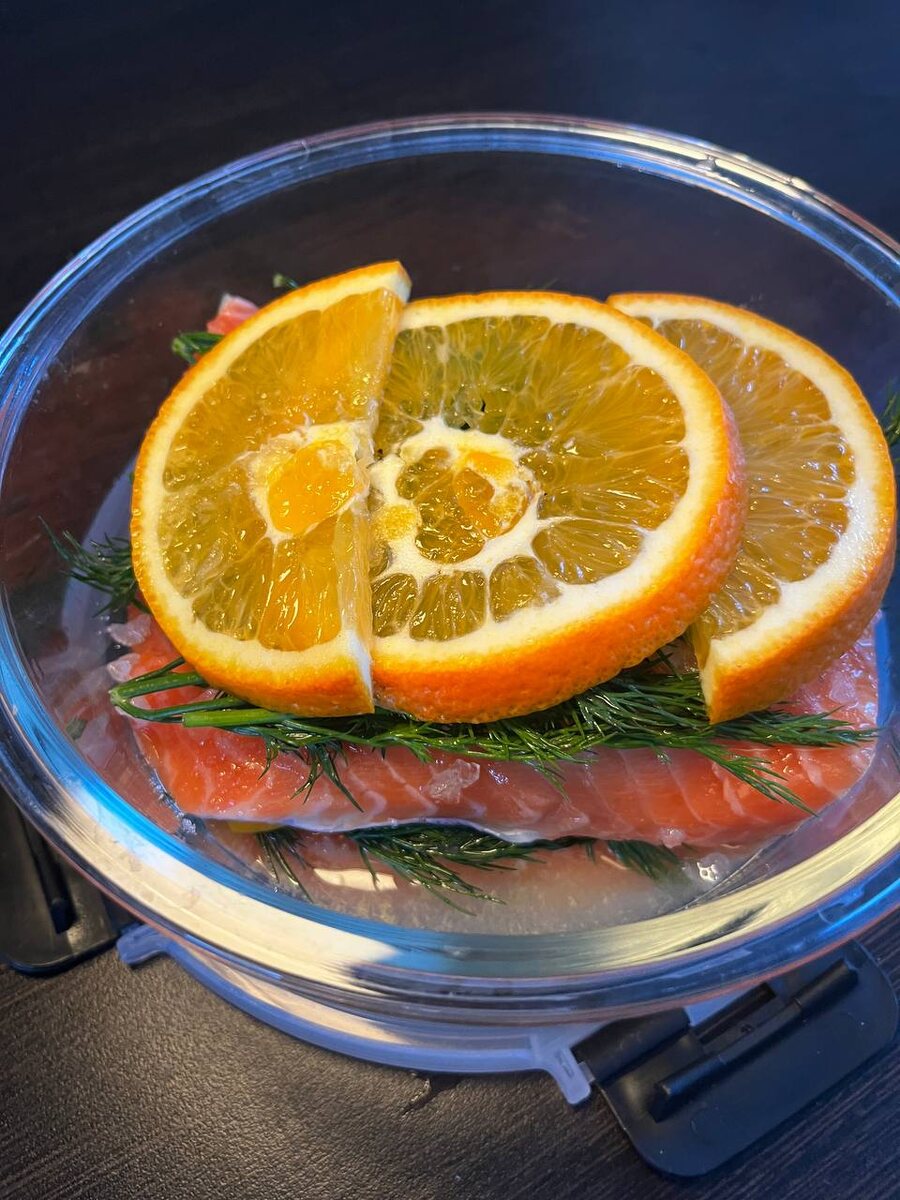 Хотите удивить любимого(ую)? Не нужно стоять у плиты весь вечер — блюда из моей подборки готовятся за 15 минут. Это просто, быстро и по-домашнему вкусно. Заберите рецепты в боте и сделайте праздник вкусным. 🐟🐟🐟 Я уже писала, что очень люблю классические блинчики. Один из моих абсолютных фаворитов — блины с красной рыбой и сметаной. Именно со сметаной. Красную рыбу я солю сама. В последнее время это выходит намного выгоднее и проще. В этот раз солила рыбу с апельсином, вкус получается мягкий и свежий. Ингредиенты • красная рыба — 500-700 г • соль — 3 чайные ложки • сахар — 1 чайная ложка • укроп — пучок • апельсин — половина Как солить рыбу • Рыбу выкладываем в ёмкость. • Посыпаем солью и сахаром. • Сверху кладём укроп. • Добавляем 2 дольки апельсина. • Поливаем соком из дольки апельсина. • Накрываем и убираем в холодильник. • Оставляю минимум на сутки — 24 часа. • Можно сделать с утра до вечера, но мне так вкус нравится меньше, я всегда оставляю до следующего дня. Получается очень