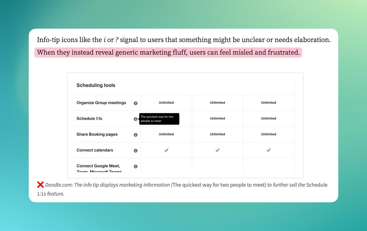У NNGroup вышла заметка неплохая Принцип золотой эпохи дизайна интерфейсов — если нужна подсказка, работа над дизайном не проделана. Дизайнер не разобрался в задаче, а буквально подпёр костылём Почему подсказка симптом плохо сделанной работы? Подсказка — симптом: дизайнер не облёк смысл в поток самодостаточного взаимодействия с интерфейсом. Не переосмыслил задачу Это часто болезненная штука в нашей работе: разница между выполнить формулировку и решить проблему Задача почти всегда написана языком организации, а не пользователя. Там много скрытых допущений: юридических, маркетинговых, KPI-ных, исторических («у нас так принято»), технических («это уже сделано вот так»). Если дизайнер просто реализует буквальный текст задачи — он обслуживает эти допущения, не проверяя, ведут ли они к ясности взаимодействия Как решить задачу? Сделать шаг назад: переформулировать задачу как пользовательскую цель: • объяснить ценность и дать контроль • помочь быстро и без ошибок завершить сценарий И ин