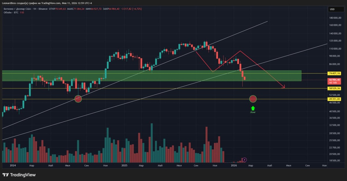 🕯 ❓ Сколько можно падать ❓ ⚠️В продолжение утренних мыслей, график, который вам отлично знаком, вернее его разметка, сценарий которой отработал на 99%, лишь не доехав 2% до обозначенного уровня!! ‼️Пробита ключевая зона поддержки уровня 74К с его блоком, будем говорить большая его половина, а сопля свечи прошлой недели заглянула под него. Вместе с тем, график пробил глобальную восходящую трендовую и закрыл под ней крайнюю неделю целиком!! ❓ Какие варианты и что должно произойти для того или иного сценария?? 1️⃣ Закрываем текущую неделю телом свечи под блоком = едем ниже вплоть до уровня 49К, с отработкой всего давления, которое консолидировалось над блоком. Именно туда технически смотрит реализация общего паттерна. Плюс к этому, данный уровень является Low сопли мощного слива рынка от 5го августа 2024 года, о котором конечно же никто уже и не помнит. Но, после того самого падения, полноценного ретеста Low тени так и не произошло, что может свершиться на текущем снижении!! 🔤 А т