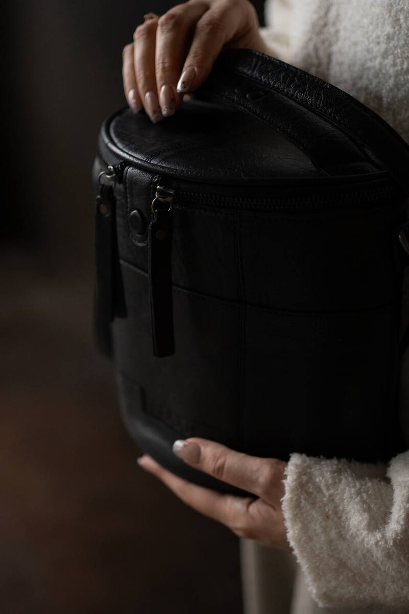 Grace Muud имеет интересную форму полуцилиндра. Что позволяет удобно носить её на плече или в руках, комфортно прилегая к нашему телу. Стенки сумки жесткие. Множество карманов дает возможность уместить все необходимые спицы и аксессуары для вязания. Также можно разместить карандаши, кисти или маркеры. Внутри есть карман на молнии на крышке сумки и открытые карманы внутри основного отделения. Ещё имеется кожаный ремешок с двумя карабинами. К ним можно прицепить пропуск от работы или ключи. Высота сумки 20см и в неё легко можно сложить среднего размера проект или несколько моточков в дорогу. Итак, сумка закрывается на молнию и кнопку, снаружи и внутри 3 открытых кармана. Также внутри 1 карман на молнии. Регулируемый ремень и есть ручка, чтобы носить сумку в руке. Доступные оттенки whisky и black. Сумку можно посмотреть и приобрести на сайте. Наличие на Авиамоторная,19 уточняйте по телефону 8 925 005 9 006.