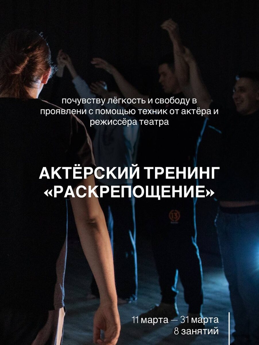 » 11 марта — 31 марта Приглашаем вас в уникальное пространство, где можно быть собой — без оценок, масок и скованности. Что мы создаём вместе: 🌟 Безопасную атмосферу — здесь не страшно быть разным, пробовать, ошибаться и раскрываться 🌟 Пространство чистой практики — где каждый проживает опыт, а не просто слушает о нём 🌟 Сообщество энергии — где вы заряжаетесь от смелости других и сами становитесь источником вдохновения Вас ждёт на тренинге: • Живая импровизация и свободное проявление эмоций • Работа с телом, голосом и жестом • Упражнения на доверие и контакт с незнакомцами • 8 встреч-исследований, где теория становится вашим навыком Преподаватели: @NikolayChernovikov @Kalinina_actress Мы не учим «как надо», а создаёт условия, где вы можете найти свой способ быть свободным и искренним. Для кого этот тренинг: • кто хочет говорить и двигаться свободнее, • ищет живое общение и вдохновение, • готов исследовать себя в доброй компании единомышленников. Старт новой группы — 11 марта