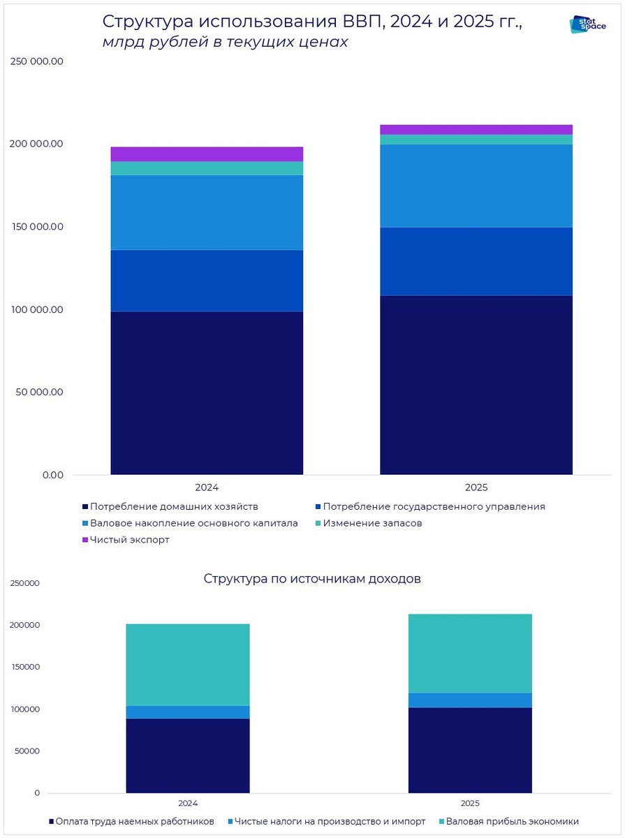 Что интересного произошло со структурой ВВП в прошлом году: выросла доля потребления домашних хозяйств (с 49.7% в 2024 до 51.1% в 2025), и госпотребления (с 18.5% до 19.4%). Немного прибавило и валовое накопление основного капитала. За счёт чего рост? За счёт снижения изменения запасов (+2.8% против +4.1% годом ранее) и падения доли чистого экспорта с 4.4% до 2.6% (в деньгах он тоже упал). В разрезе доходов: почти на 4 п.п. выросла доля оплаты труда! И на 4.7 п.п. снизилась доля прибыли.