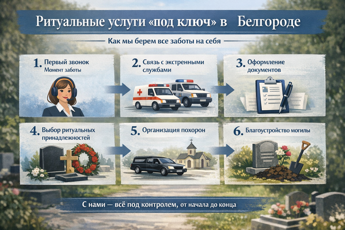 Вступление: Слово «под ключ» звучит просто, но в ритуальной сфере оно несёт огромный смысл. Когда семья сталкивается с потерей близкого, каждая минута на счету, а стресс и бюрократия отнимают силы. Полный комплекс ритуальных услуг под ключ позволяет пройти через этот сложный период спокойно, доверяя организацию профессионалам. Мы расскажем, что именно включает этот сервис в Белгороде, чтобы стало понятно, за что платят и что получают. Основные этапы: 1. Первый звонок — момент заботы