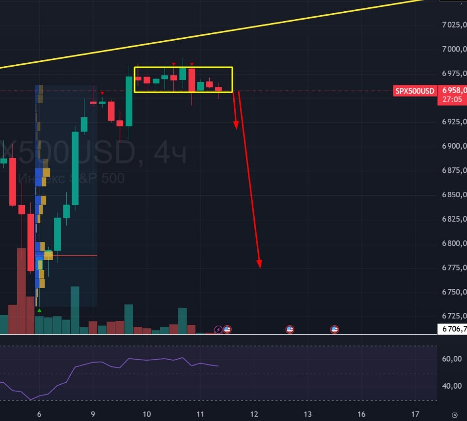 📈 Индекс S&P500 🟢Последний раз писал про S&P500 16-го января, когда там рисовался клин с целями на 6800 и ниже. Прогноз был полностью отработан. После этого были сильные падения в металлах и в крипте, а S&P500 пошатался и остался на тех же значениях, где мы сегодня. 🟢В текущий момент индекс встал в накопление. Оно может быть как лонговым, так и шортовым. С учетом того, что металлы и биткойну у нас силы не показывают, а так же в самом S&P не видно силы до американской торговой сессии, то предположу, что выход из накопления будет вниз. 🚗 Куда бы индекс не выше - такие накопления удобно торговать, т.к. понятен уровень для стопа. Жду американский индекс в коррекцию в ближайшее время. #sp500 #nasdaq #spy #spx #spyf #рыноксша #сиплый #прогноз #макро #bogdanoffinvest $SFH6 $SFM6 $NAH6 $NAM6