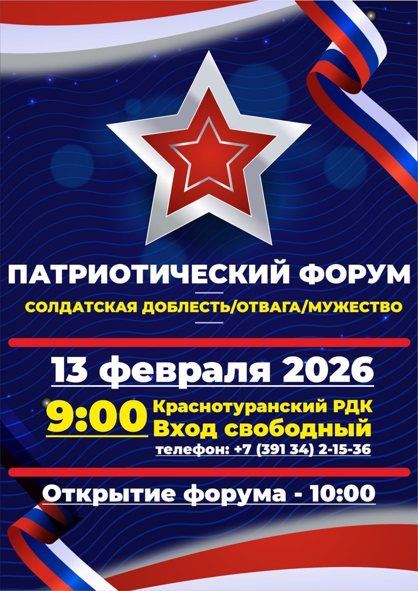! 🇷🇺Приглашаем на Патриотический форум «Солдатская доблесть, отвага и мужество», посвященный Дню воина-интернационалиста. Форум состоится 13 февраля в Краснотуранском Доме культуры. Программа форума: ✅9:00 – начало регистрации участников (Краснотуранский РДК– Ленина, 39); ✅10:00-10:20 – официальное открытие форума (Краснотуранский РДК– Ленина, 39); ✅10:20-11:30 – панельная дискуссия (Краснотуранский РДК– Ленина, 39); Работа площадок: ✅11:30 – 13:15 - Уроки мужества (Дом детского творчества – Ленина, 20); ✅11:30 – 13:15 – Военно-спортивная подготовка (Центр физкультуры и спорта – Ленина, 36); ✅11:30 – 13:15 – Брейн-ринг (Краснотуранский РДК – Ленина, 39) ✅11:30 – 13:15 – Адаптация военнослужащих (КЦСОН – Ленина, 37) ✅14:30 – 15:30 – Закрытие форума, торжественный концерт (Краснотуранский РДК – Ленина, 39) Приглашаем всех жителей и гостей округа принять участие в Патриотическом форуме «Солдатская доблесть, отвага и мужество».