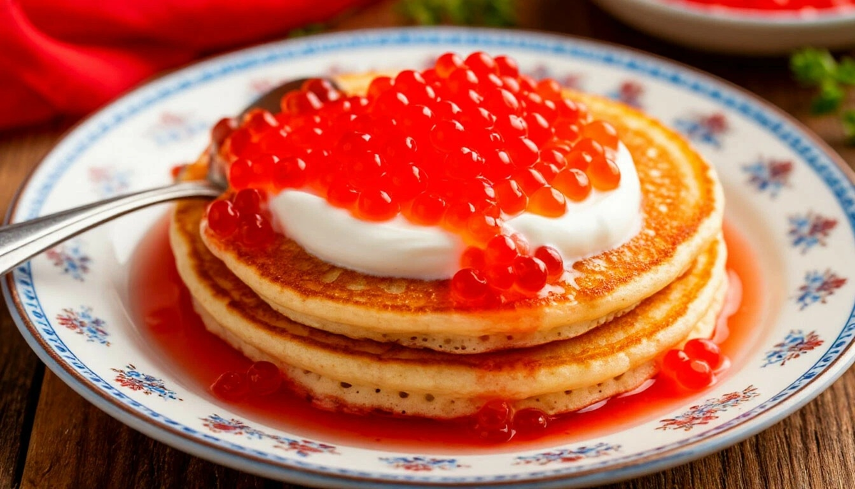 Это блины уровня ресторана. Они не просто пышные — они тающие, с кремовым оттенком вкуса, без малейшего намека на «резиновость». Икра на таких блинах — это уже не просто еда, а искусство.