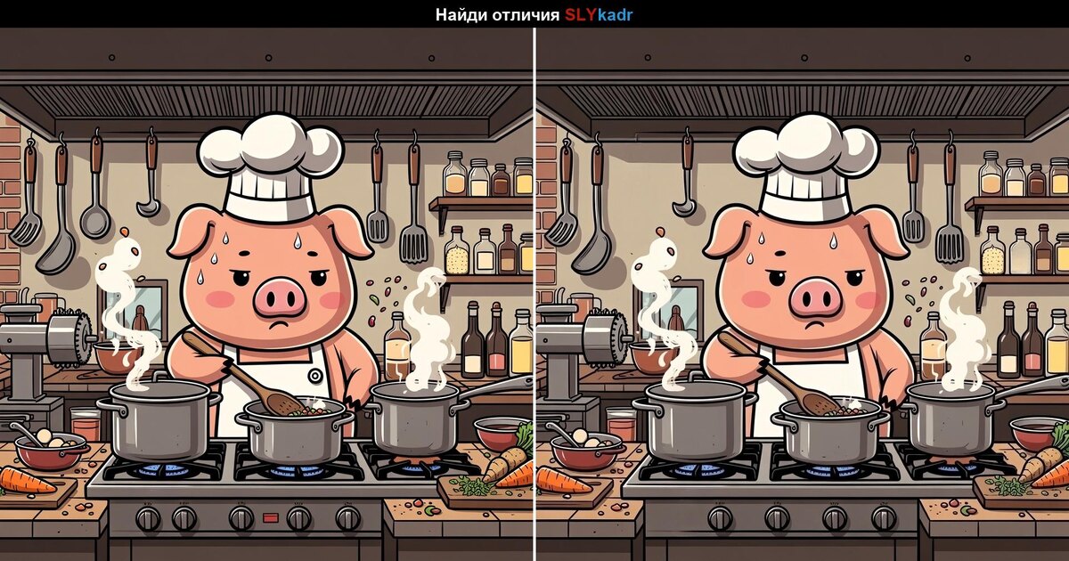 Наш поварёнок вовсю колдует на кухне, но что-то здесь явно не так… Перед вами две почти одинаковые картинки. Сможете ли вы найти все отличия, пока суп не убежал? 🍲🔥