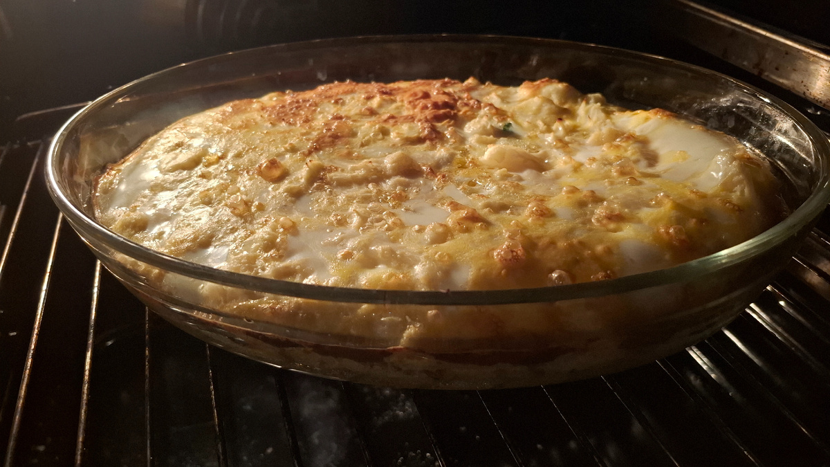 3. Сборка. Форму для запекания щедро смажь сливочным маслом. Выложи вареную капусту ровным слоем. Залей яйцами так, чтобы они покрывали капусту.
