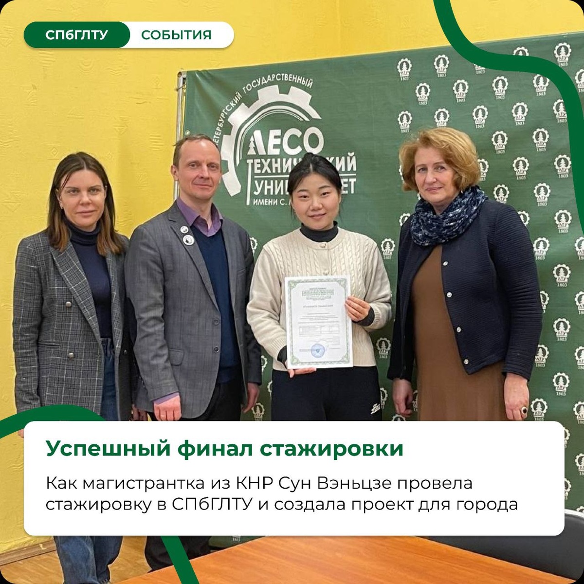 ! Магистрантка из Китая Сун Вэньцзе успешно завершила стажировку в нашем университете по направлению ландшафтного дизайна. Куратор стажировки, директор Института ландшафтной архитектуры строительства и обработки древесины Александр Сергеевич Крюковский, высоко оценил достигнутые результаты. А директор Международного центра бизнеса и образования Светлана Викторовна Терещенко предложила Сун Вэньцзе рассмотреть поступление в аспирантуру СПбГЛТУ в следующем учебном году. Это важный шаг в развитии академического обмена и создании общей платформы для практики студентов и аспирантов СПбГЛТУ и наших партнёров из Северо-Восточного университета лесного хозяйства Китая. Поздравляем Сун Вэньцзе с успешным завершением стажировки и ждём новых совместных проектов! 🎉 Подробнее о том, как проходила стажировка читайте на нашем сайте #СПбГЛТУ #СПбГЛТУ_события 👻 МАХ | 📲 ВК | 📝 ДЗЕН