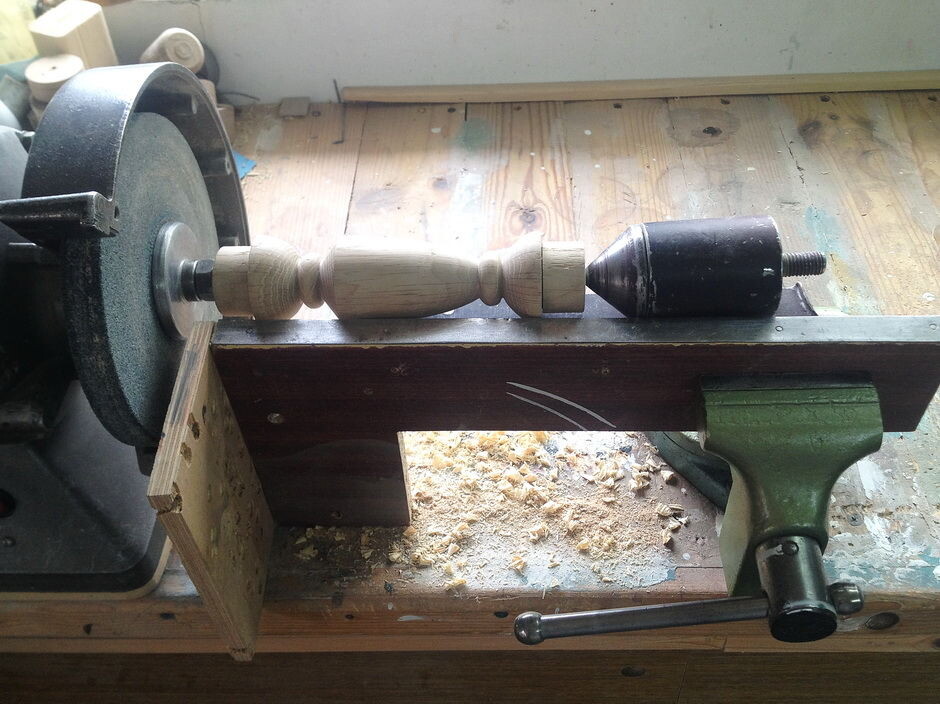 Хочу поделиться с вами некоторыми своими самоделками. Надеюсь, кому-то будет полезно. 1. Токарный станок по дереву. Это примитивный токарный станок, на котором я обрабатываю заготовки длиной до 40 см и диаметром до 50 мм. А мне больше и не нужно для изготовления декоративных изделий. Как правило, это балясины полок для икон. Зачем покупать дорогостоящие станки, которые будут простаивать и занимать место в мастерской. Что касается моего приспособления, то оно состоит из точильного станка, тисков и задней бабки, которая прикреплена к куску уголка 35х35 мм. Её можно выточить у любого токаря. В качестве упора я использовал ДСП с закреплённой сверху металлической пластиной, по которой передвигается резец. Дёшево и сердито! Разбирается приспособа за 6 секунд. Да, что самое простое — в качестве хвостовика я использовал гайку под ключ 19, которая зажимает абразивный круг на валу станка. В этой гайке просверлил два отверстия D 3 мм каждое, в которых закрепил заточенные плоские штифты, (на них н