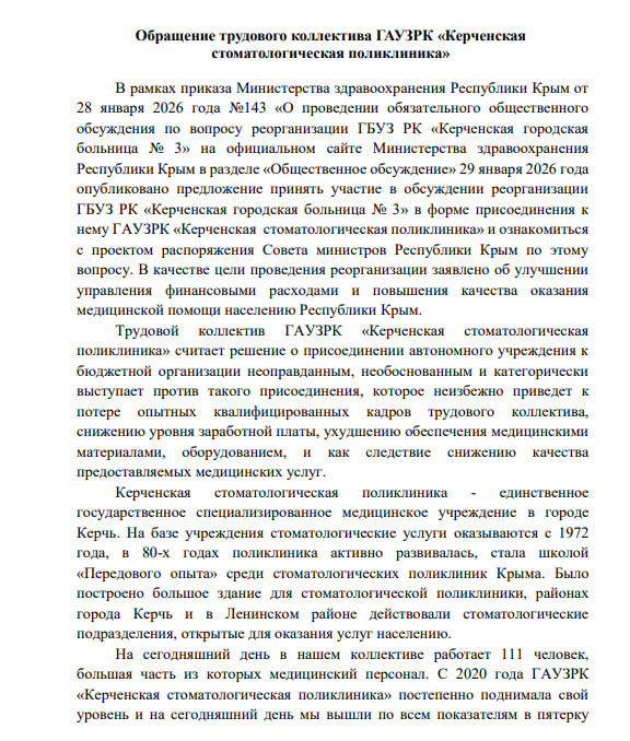 История вокруг реорганизации Керченской стоматологической поликлиники получила новое развитие. После публикации информации о планируемом присоединении учреждения к Керченской городской больнице №3 трудовой коллектив направил официальное обращение, в котором подробно изложил свою позицию и заявил о категорическом несогласии с реорганизацией. В чём суть реорганизации Министерство здравоохранения Республики Крым объявило общественное обсуждение проекта распоряжения Совета министров РК о реорганизации ГАУЗ РК «Керченская стоматологическая поликлиника» в форме присоединения к ГБУЗ РК «Керченская городская больница №3». В пояснительной записке к проекту указано, что цель реорганизации — «улучшение управления и финансирования, экономия бюджетных средств и повышение доступности и качества медицинской помощи». «Нас поставили перед фактом» Как ранее сообщала редакция КерчьИНФО, сотрудники стоматологической поликлиники заявляли, что решение о реорганизации было принято без диалога с коллективом