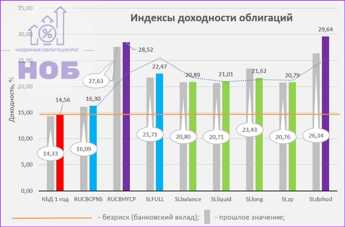 ✅ Максимальная процентная ставка по вкладам, публикуемая Банком России, 14,57% за третью декаду января, незначительно и постоянно снижается; ✅ Индекс ОФЗ (КБД публикуется на сайте Мосбиржи) с дюрацией 1 год (КБД 1 год на графике👆) - почти без изменений; ✅ Индекс корпоративных облигаций RUCBCPNS (публикуется на сайте Мосбиржи) - почти без изменений; ✅ Индекс высокодоходных облигаций RUCBHYCP (публикуется на сайте Мосбиржи) - вырос на процент; 📌 Индекс полной доходности Списка Лучших облигаций 2025 SLFULL вырос почти на полпроцент. В Список вошло 74 облигации вместо 63 ранее, общий порог входа по YTM/CY не менялся. ✅ Индекс SLbalance портфеля СБАЛАНСИРОВАННЫЙ - рост 0,5%; ✅ Доходность ликвидной части Списка SLliquid - рост около 0,5%; ✅ Индекс портфеля ДОЛГОСРОЧНЫЙ SLlong - снижение более процента; ✅ Индекс облигаций с ежемесячным купоном SLzp - без изменений; ✅ Портфель ДОХОДНЫЙ (индекс SLdohod) - рост на 3 процента. Как формируются индексы (ссылка активна). Состав портфелей обновлённ