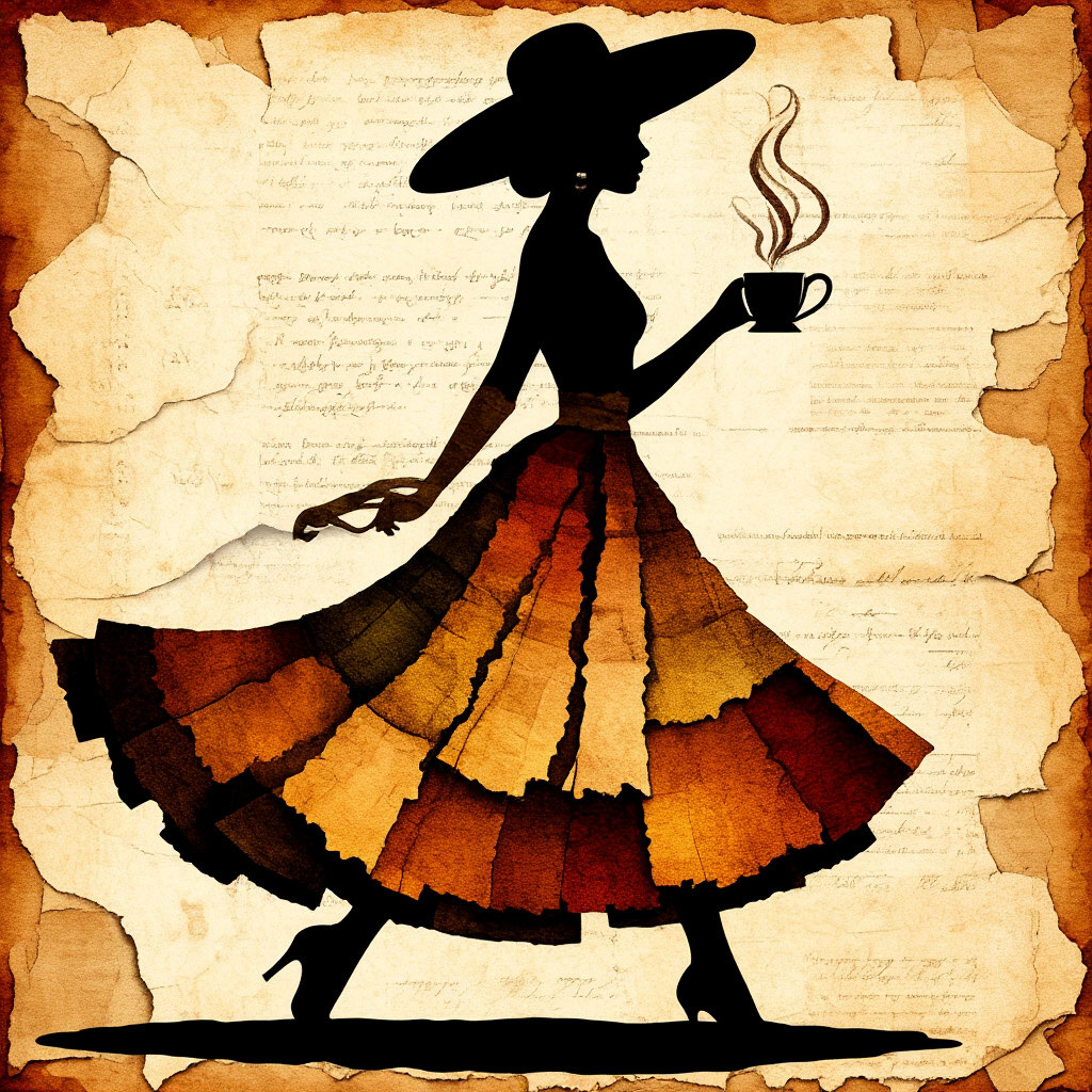 Промт 1: Основной винтажный коллаж (4:5): Силуэт женщины в широкополой шляпе, держит чашку с паром; длинная плиссированная юбка из лоскутков теплых осенних оттенков (терракотовый, кирпично-оранжевый, горчичный, коричневый); фон состаренный пергамент с рваными краями; стиль коллаж-иллюстрация; черный силуэт на тёплом фоне; акцент на текстуре ткани и бумаги; атмосфера уютного утреннего кофе; цветовая гамма: сепия/теплые тона; высокий уровень детализации--ar 4:5 --q 2 --v 5 --stylize 1000