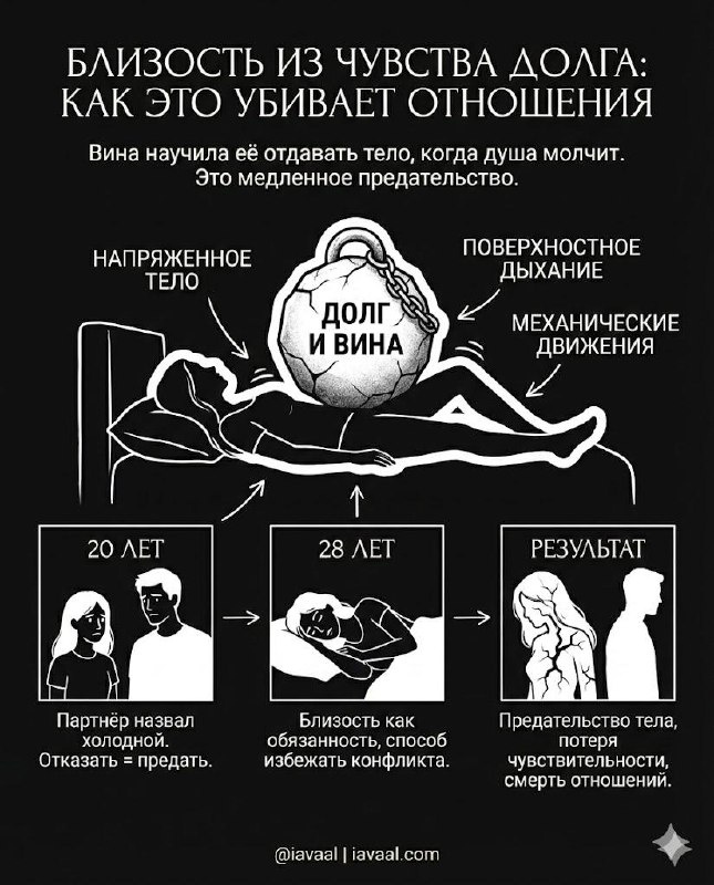 Женщина лежит рядом с партнёром, он прикасается, она понимает, что должна откликнуться, и откликается телом, но внутри пусто, никакого желания, только мысль: я должна, иначе он обидится, иначе я плохая. Не потому что не любит, а потому что вина научила её отдавать тело, когда душа молчит. Ей было двадцать, когда партнёр сказал, что она холодная, если отказывает, и девушка запомнила: отказать значит предать, значит быть плохой женщиной. Ей было двадцать восемь, когда она уже не помнила, когда последний раз сама хотела близости, потому что близость давно превратилась в обязанность, в способ избежать конфликта, в доказательство любви через тело, которое не чувствует ничего. Близость из чувства долга убивает не сразу, она убивает медленно, потому что каждый раз, когда женщина говорит телом "да", а душой "нет", внутри образуется трещина. Тело запоминает предательство, запоминает, что его желания не важны, что оно существует для выполнения чужих ожиданий. Мышцы таза зажимаются в защите, ды