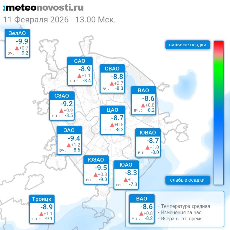 В 13:00 в Москве было от -10.1°C до -7.6°C, средняя температура -8.8°C #погода #Москва #зима #температура #11февраля #среда