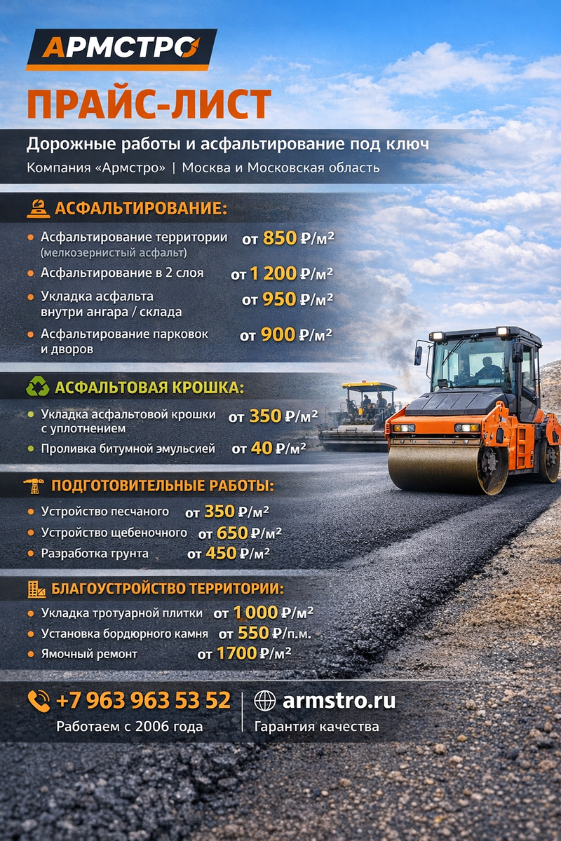 • Асфальтирование территории (мелкозернистый асфальт) — от 850 ₽/м²