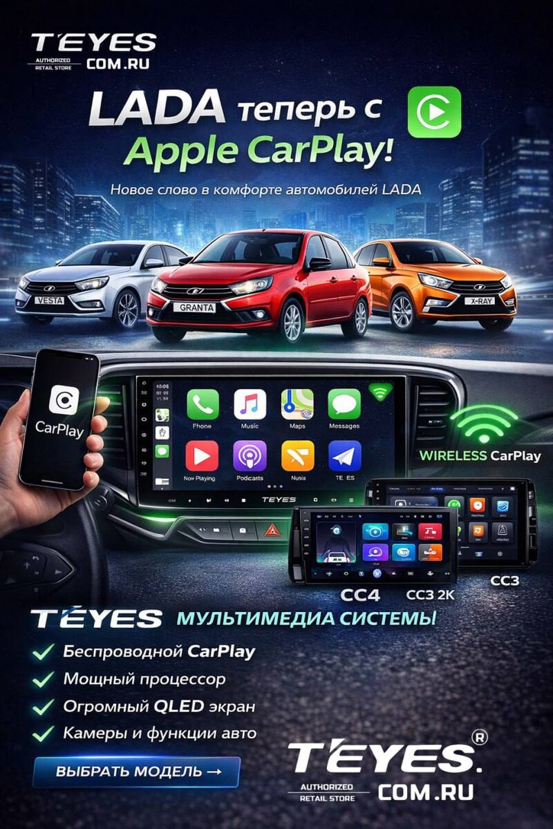 Granta, Vesta, XRay, Largus — теперь CarPlay в них подтверждён на уровне Apple. Но есть нюанс. Заводская поддержка - это базовый функционал и только в определённых комплектациях. А если экран маленький? А если его вообще нет? А если хочется больше, чем просто «работает»? Вот тут и начинается разница. 📱 TEYES — это не просто CarPlay. Это полноценная мультимедийная система. В моделях CC3, CC3 2K, CC4 реализована поддержка Apple CarPlay, включая беспроводное подключение (без кабелей и лишних движений). Что вы получаете с TEYES: ✔️ Большой современный экран ✔️ Быстрый интерфейс ✔️ Полноценный Android + приложения ✔️ Камеры, парктроники, динамические линии ✔️ И при этом — Apple CarPlay Apple только добавила LADA в список. TEYES уже давно делает её современнее.