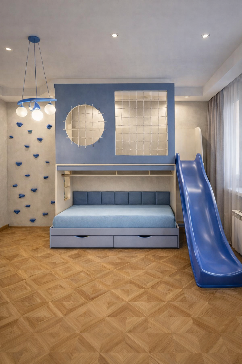 Большинство родителей сталкиваются с одинаковой ситуацией: у ребёнка есть своя комната, но живёт он всё равно рядом с родителями — в гостиной, на кухне или в спальне. Игрушки переезжают по квартире, игры происходят на полу, а детская используется только вечером. Мелек — известная певица из Казани и мама. Ей хотелось не просто оформить интерьер, а сделать пространство, где ребёнку действительно будет интересно находиться каждый день. Главная задача звучала просто: комната должна стать любимым местом в доме. Чаще всего детскую строят вокруг кровати: шкаф, стол, полки.
