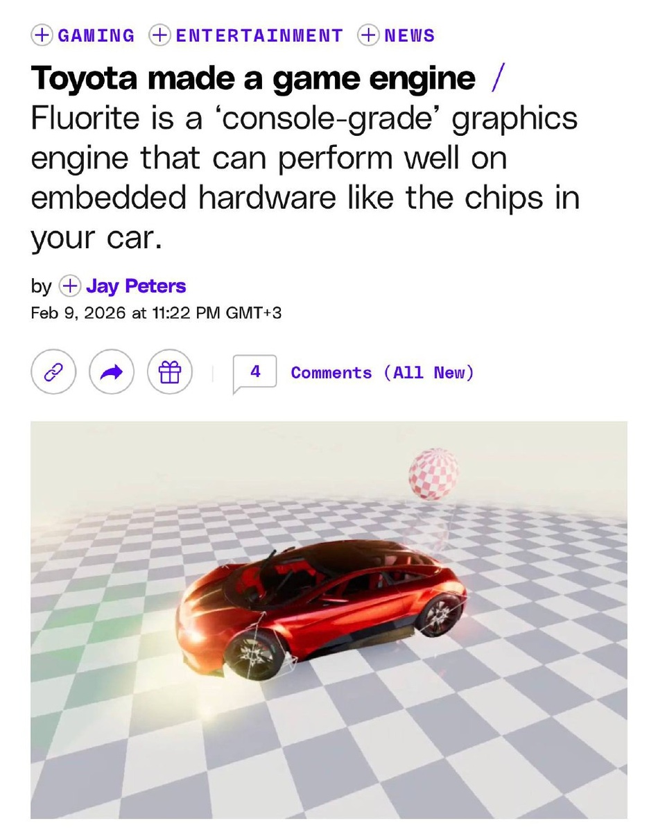 Toyota разрабатывает собственный игровой движок Fluorite, предназначенный для цифровых приборных панелей автомобилей. В отличие от Unity и UE4, которые часто используются автопроизводителями, Fluorite не требует дорогих лицензий и обладает меньшими системными требованиями. Разработчики обещают графику консольного уровня и отсутствие багов в течение первых 400 тыс. километров эксплуатации. https://dzen.ru/id/5c0e38ff46ef5c00aaa80527