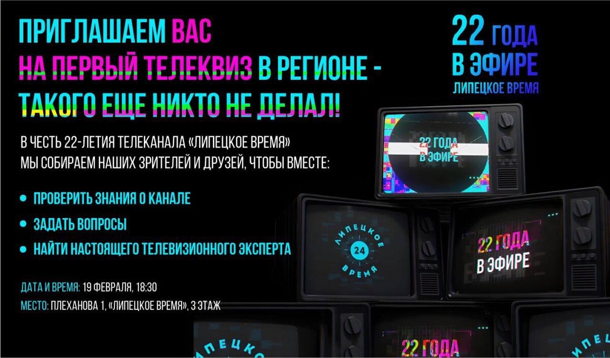 ! В честь 22-летия телеканала «Липецкое время» мы собираем наших зрителей и друзей, чтобы вместе проверить знания о телеканале «Липецкое время» в целом и о телевидении в частности, задать вопросы и найти настоящего телевизионного эксперта. Проверьте себя, покажите, что вы знаете «Липецкое время», и получите удовольствие от дружеской интеллектуальной игры! Телеквиз пройдет в нашей телевизионной студии — это уникальная возможность увидеть, где создается эфир, и почувствовать атмосферу телеканала. ❗️Регистрация открыта до 16 февраля. Количество участников ограничено — успейте записаться! 📅 19 февраля, 18:30 📌 Записаться можно по форме