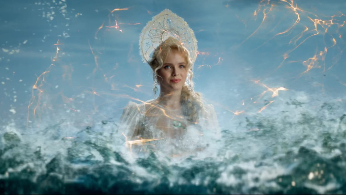 В кокошник, бусы и красную вышитую юбку одета даже чудесная белочка, грызущая золоченые орешки. Это огромная особь, каких в природе не встречается, размером с мини-пига, хотя тонкостью компьютерной выделки она похвастаться не может: ее ворсинки напоминают скорее жесткую свиную щетину, чем беличий мех. Развязно приплясывая, белка исполняет песню «Во саду ли, в огороде» примерно в такой же аранжировке, напоминающей звуки электронной игрушки, что и в экранизации 1966 года Александра Птушко. В сочетании с белочкиным луком, габаритами и злобной мордочкой этот номер производит несколько инфернальное впечатление: в какой-то момент представляется, что взбесившаяся белка, как гигантская кукла из «Игры в кальмара», вдруг грозно развернется и начнет расстреливать толпу ядрами из чистого изумруда.